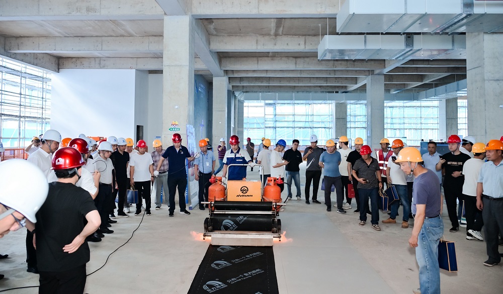 浙江東方雨虹現場分享建筑防水、建筑涂料、砂漿粉料、土工防滲、樓板隔聲、混凝土防腐、金屬涂裝、非織造布、運動地坪、雨虹管業等 “一超九強”產品、智能型卷材攤鋪車坦途-100的優異性能和應用場景,并展示改性瀝青涂料熱熔施工的標準化操作。